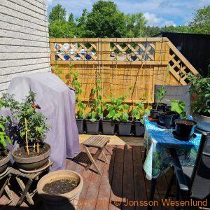 Gurkorna blir det lite många av (grannarna blir glada), sallad i olika former, basilikan (kom inte med på bild) men den är präktig, blandkrukan med både persilja, timjan och gräslök har blivit stor och kom inte heller med på bild. Potatis har vi sått men det blev inte som förra året men helt ok.