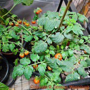 Det kommer tomater på den till höger och till vänster är vår övervintrade ena chiliplanta (en choklad habanero)