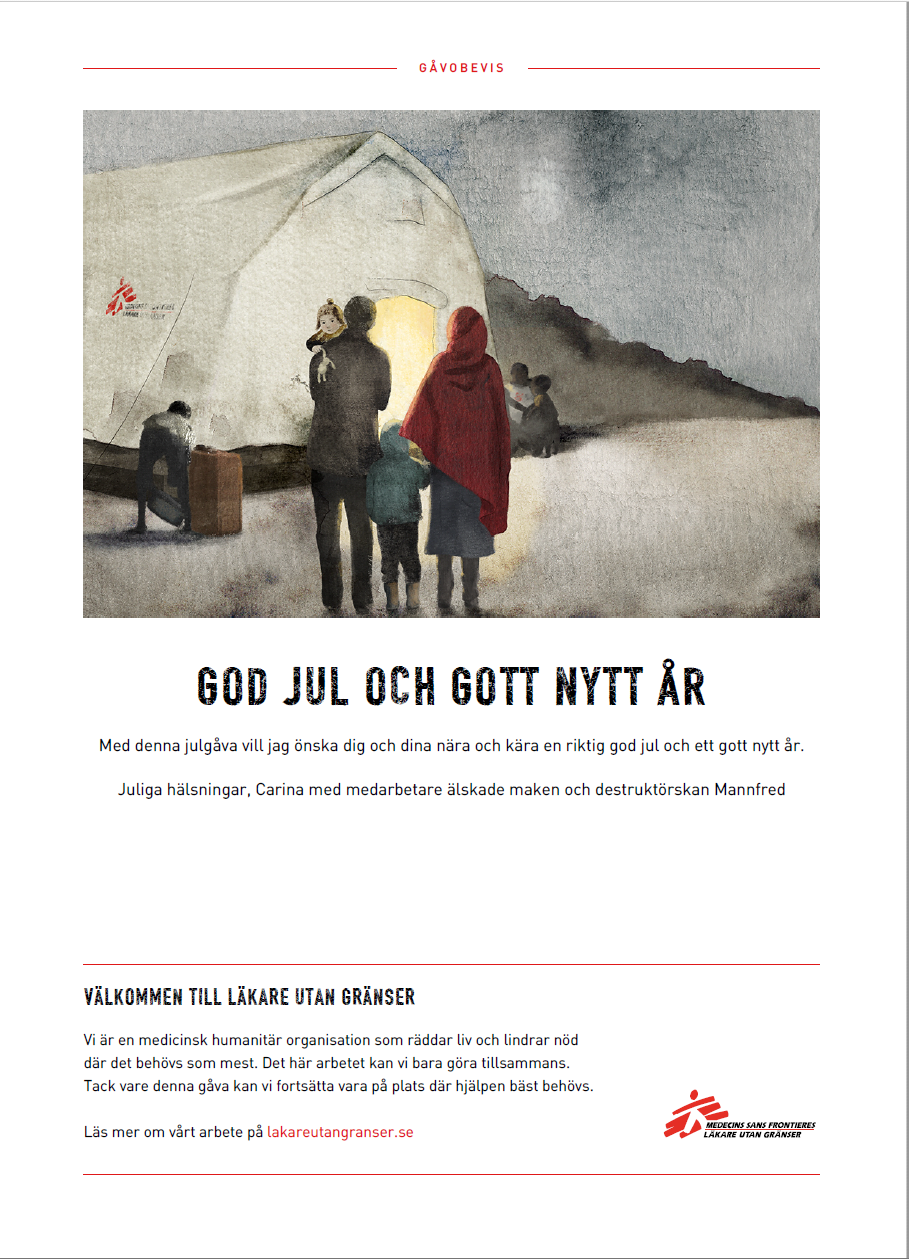 Vi hoppas också att världsläget går åt det mer stabila läget trots att det är tufft. Därför har vi valt Läkare utan Gränser för vår julgåva.