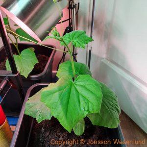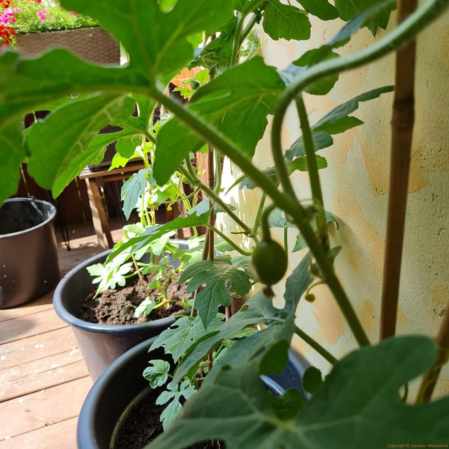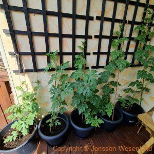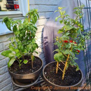 Altan grödor växer på trots det svala vädret. Två fikon skördade (man lär sig nya saker hela tiden). Paprikorna och chili är på gång och tomaterna. Pepino gold är på g med flera blomklasar. Gurkorna (inte med på bild) tar sig också. Tomaterna fick många grönsaksfly men set ser ut som vi vann kampen i år och det är en hel del stora gröna tomater. Blommorna tar sig ordentligt och chokladblomman, stjärnöga, alunrot och övriga blommor gror fint